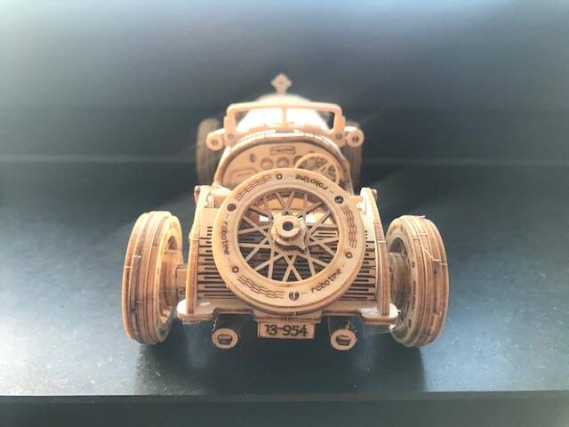 Vooraan heb je een balk met daarop de koplampen, daaronder zit de zwengel om, zoals dat toen was, de motor te starten, daar vlak achter zit de grote koelradiator om de motor af te koelen. En dan heb je, verder naar achter, de bolle motorkap met tekeningen van de revetten/klinknagels waarmee het plaatstaal waaruit het plaatwerk van deze auto’s gemaakt was aan elkaar is gezet. Ook zit op de motorkap de benzinedop, want de tank zat bij deze auto’s tussen de motor en het interieur van de auto. Hierachter heb je dan een rechtopstaande voorruit waarachter zich dan weer het interieur bevindt. En over het interieur gesproken: daar heb je het dashboard dat voorzien is van tekeningen van metertjes en andere typische dashboard atributen + ook een mooi voelbaar stuurwiel met 3 spaken. Verder is er in het interieur ook nog de versnellingspook en 2 hele mooie en realistische kuipzetels mooi naast elkaar. Achteraan op de kofferbak ligt het reservewiel dat er net zo uitziet als de 4 wielen die we daarnet al beschreven. En dan hebben we tenslotte nog helemaal achteraan de bumper, achterlichten en nummerplaat + de 2 uitlaatpijpen die mooi onder de auto vandaan komen.